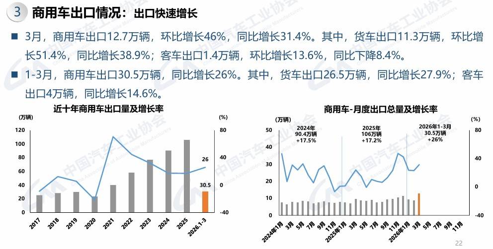 在出口方面,商用車市場同樣表現(xiàn)出色。2026年3月,商用車出口12.7萬輛,環(huán)比增長46%,同比增長31.4%。其中,貨車出口成為主力軍,達到11.3萬輛,同比增長38.9%;客車出口雖然同比下降8.4%,但整體出口形勢依然向好。從累計出口來看,2026年1-3月,商用車累計出口30.5萬輛,同比增長26%,其中貨車和客車出口分別同比增長27.9%和14.6%,顯示出中國商用車在國際市場上的競爭力不斷提升。