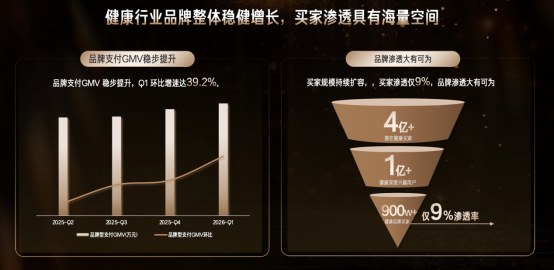 如果說品牌自身努力是內在動力,快手平臺的藍海價值與官方扶持則是外部關鍵助力??焓肿鳛閲窦壠脚_,2025年第三季度日均活躍用戶達4.16億,用戶日均觀看時長134.1分鐘,海量活躍用戶奠定堅實流量基礎。更關鍵的是,快手健康行業存在巨大藍海,平臺有4億+潛在健康買家、1億+深度興趣用戶,但品牌買家僅900萬,滲透率僅9%,為諾特蘭德提供了充足增長空間。