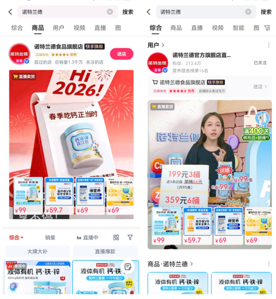 產品層面,諾特蘭德精準適配快手用戶需求,實現差異化布局。據快手官方數據,大健康商品消費中女性占比過半、消費金額占比超70%,31-49歲與50歲以上人群消費人數占比合計超85%,熟齡人群是核心群體。據此,諾特蘭德率先對其核心單品液體有機鈣·鐵·鋅實行平臺差異化包規,在快手主推3桶裝,打出品牌聲量和體量。第二階段開始,結合平臺人群打造適配商品水消消、葉黃素。其性價比突出,搭配0元試吃服務降低用戶決策門檻,精準契合快手用戶消費習慣。