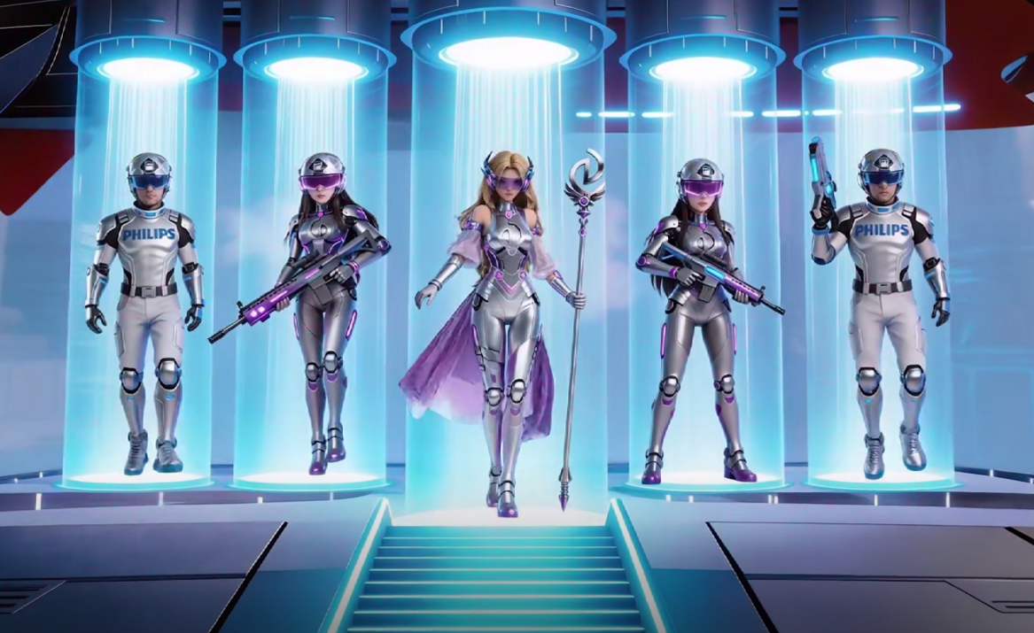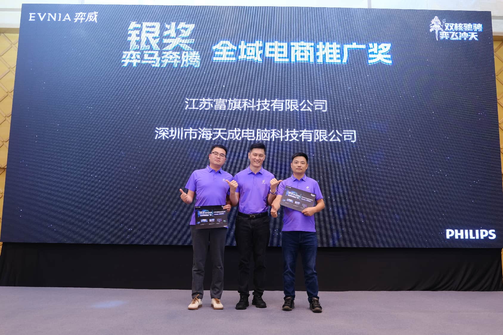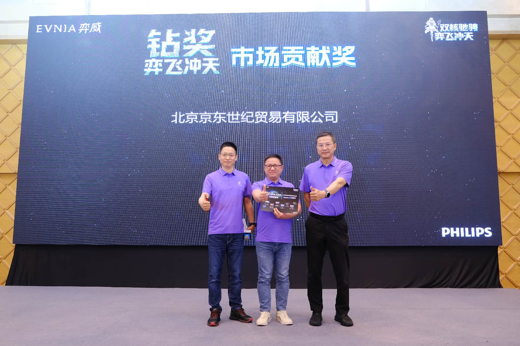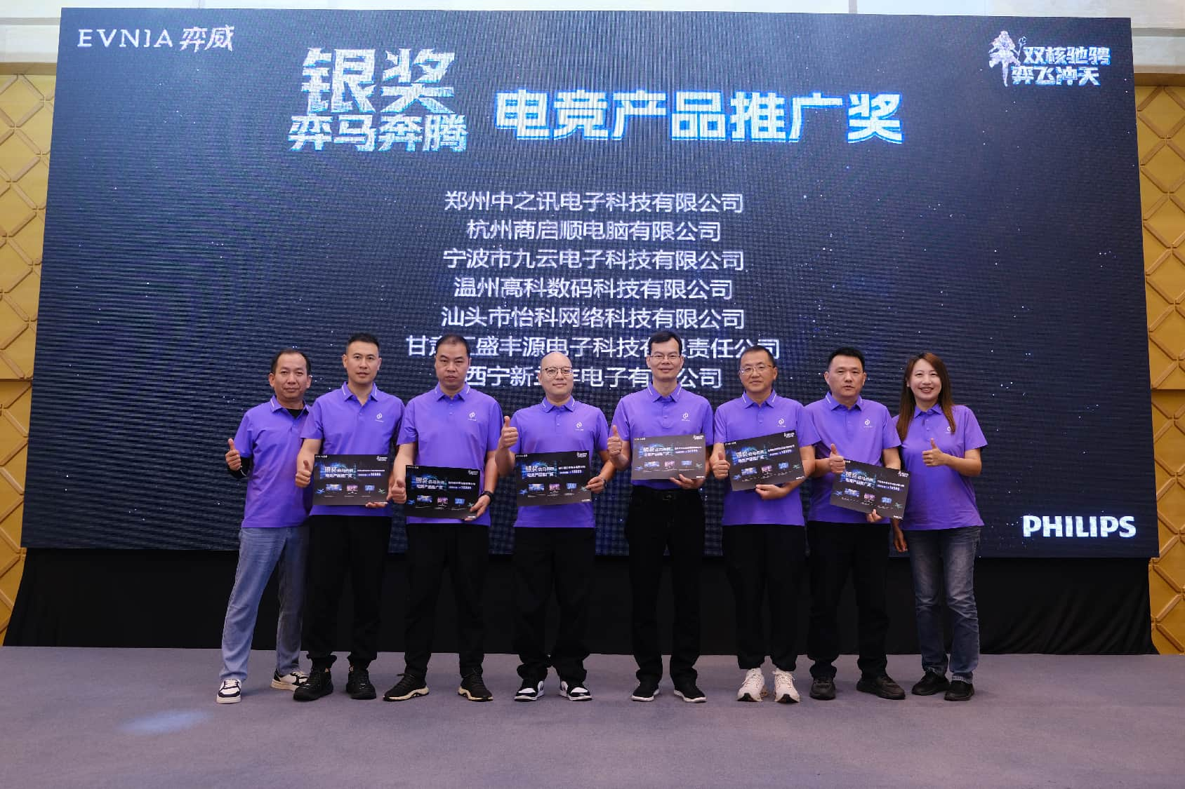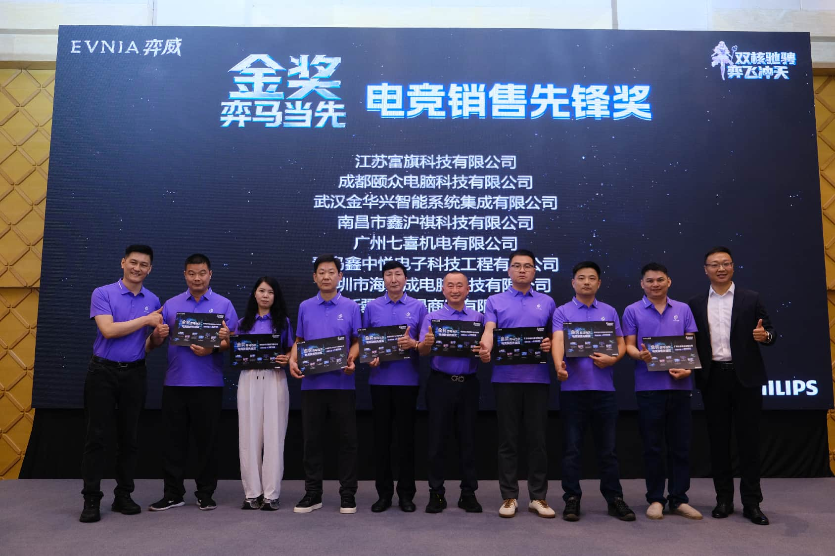 在所有年度策略分享完畢之后,簡潔而富有科技感的創(chuàng)意互動(dòng)儀式,將渠道會(huì)的現(xiàn)場氣氛推入了高潮。來自飛利浦顯示器的三位領(lǐng)導(dǎo)嘉賓閻立東、林為康、于永杰,向大屏幕中的“雙E”能量注入了PHILIPS與EVNIA弈威的品牌之力。隨后,代表著品牌年輕化策略的EVNIA弈威二次元虛擬形象「弈天使」,與代表著“AI+健康”雙核戰(zhàn)略的光影飛馬一起“弈飛沖天”,引領(lǐng)全體合作伙伴一道,攜手開啟弈威元年新征程、同心共創(chuàng)雙核賦能新輝煌。
