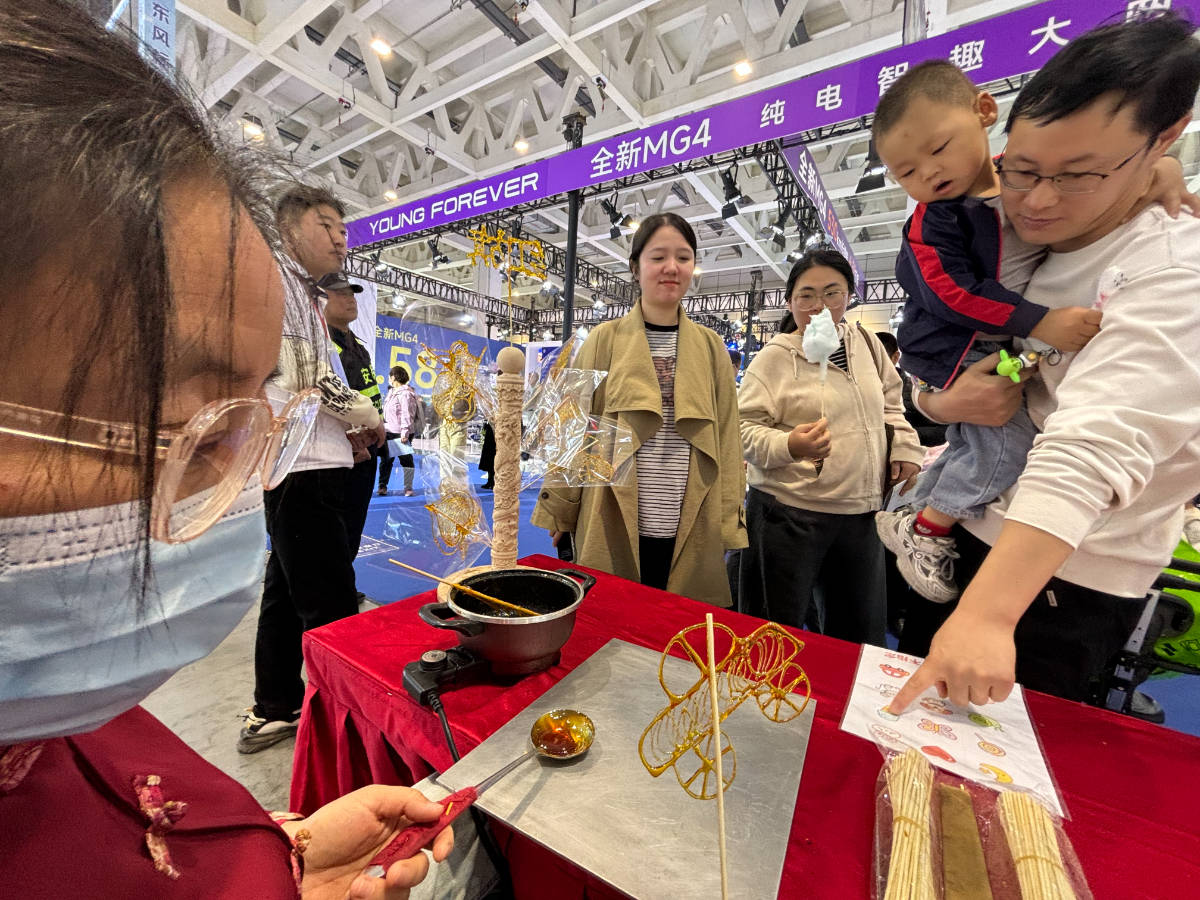 車展現場,棉花糖攤位前排起了長隊,孩子們興奮地挑選著各種顏色的棉花糖。糖畫師傅則以精湛的技藝,將糖漿化作一幅幅栩栩如生的圖案,引得孩子們陣陣驚嘆。卡皮巴拉人偶穿梭在人群中,與小朋友們親密互動,拍照留念,成為現場最受歡迎的“明星”。