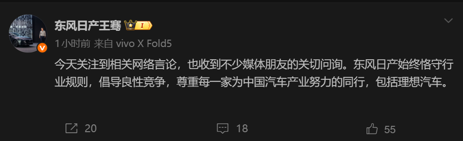 針對這一事件,東風日產汽車銷售有限公司新能源品牌總經理王騫在微博上作出了回應。王騫表示,當天關注到了相關的網絡言論,并且收到了不少媒體朋友的關切問詢。他強調,東風日產一直秉持著恪守行業規則的原則,積極倡導良性競爭,對于每一家為中國汽車產業努力拼搏的同行都予以尊重,這其中自然也包括理想汽車。