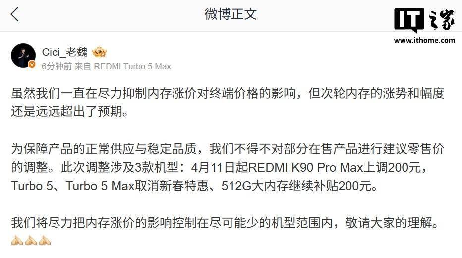 據小米中國區市場部總經理魏思琪介紹,旗艦機型REDMI K90 Pro Max全系價格上調200元。調整后,12GB+256GB版本售價4199元,12GB+512GB版本售價4699元,16GB+512GB版本售價4999元,頂配16GB+1TB版本售價5499元。該機型首銷期間曾推出限時優惠,各版本首銷價較調整后價格低200元。