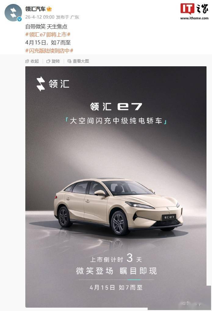比亞迪旗下領匯汽車近日宣布,其全新車型領匯e7將于4月15日正式上市。作為品牌首款產品,這款中級純電轎車以“大空間閃充”為核心賣點,目前閃充版已陸續抵達全國經銷商門店,吸引了不少消費者的關注。