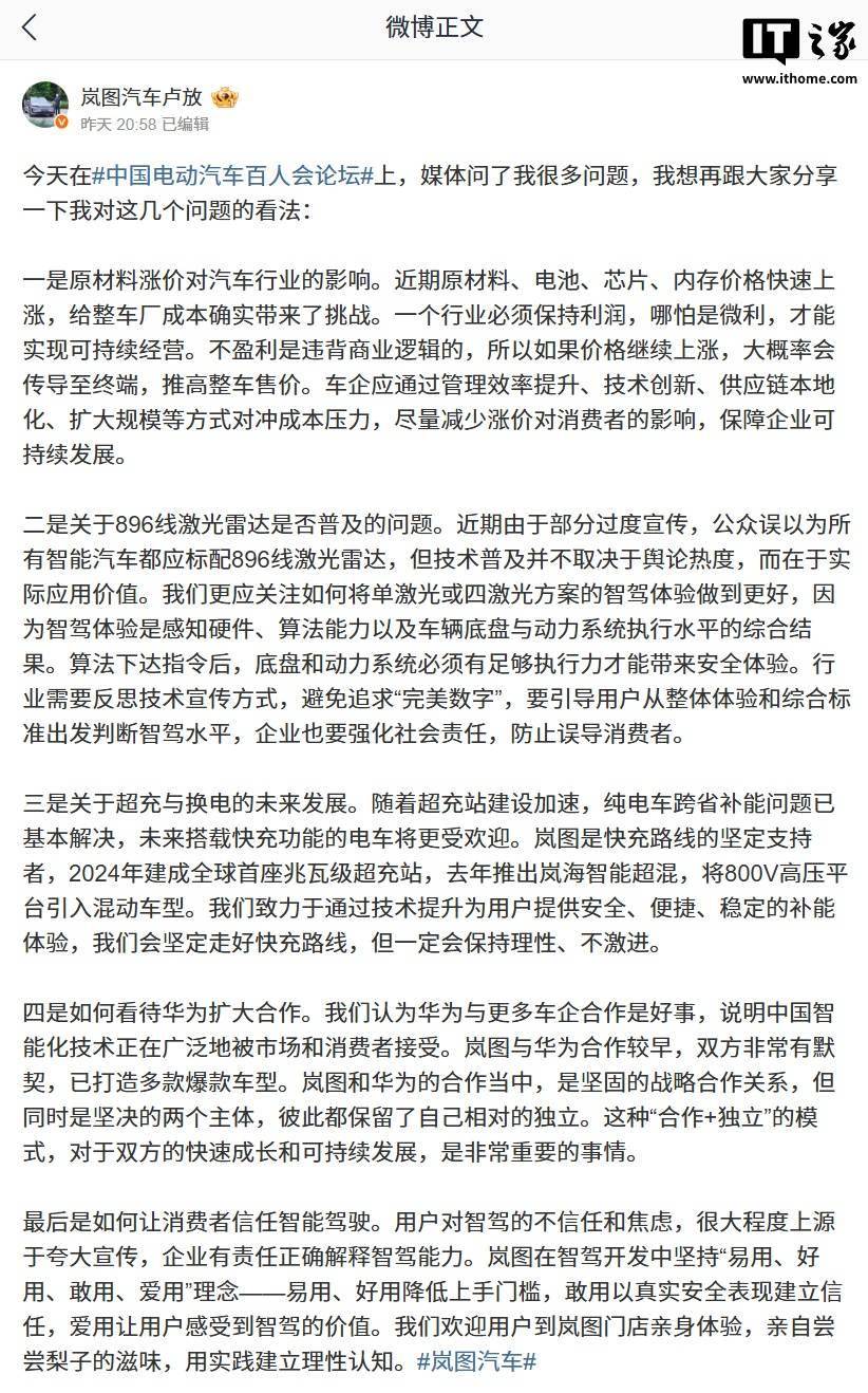 嵐圖盧放談行業(yè)熱點(diǎn):原材料漲價、智駕普及、快充路線及華為合作新解