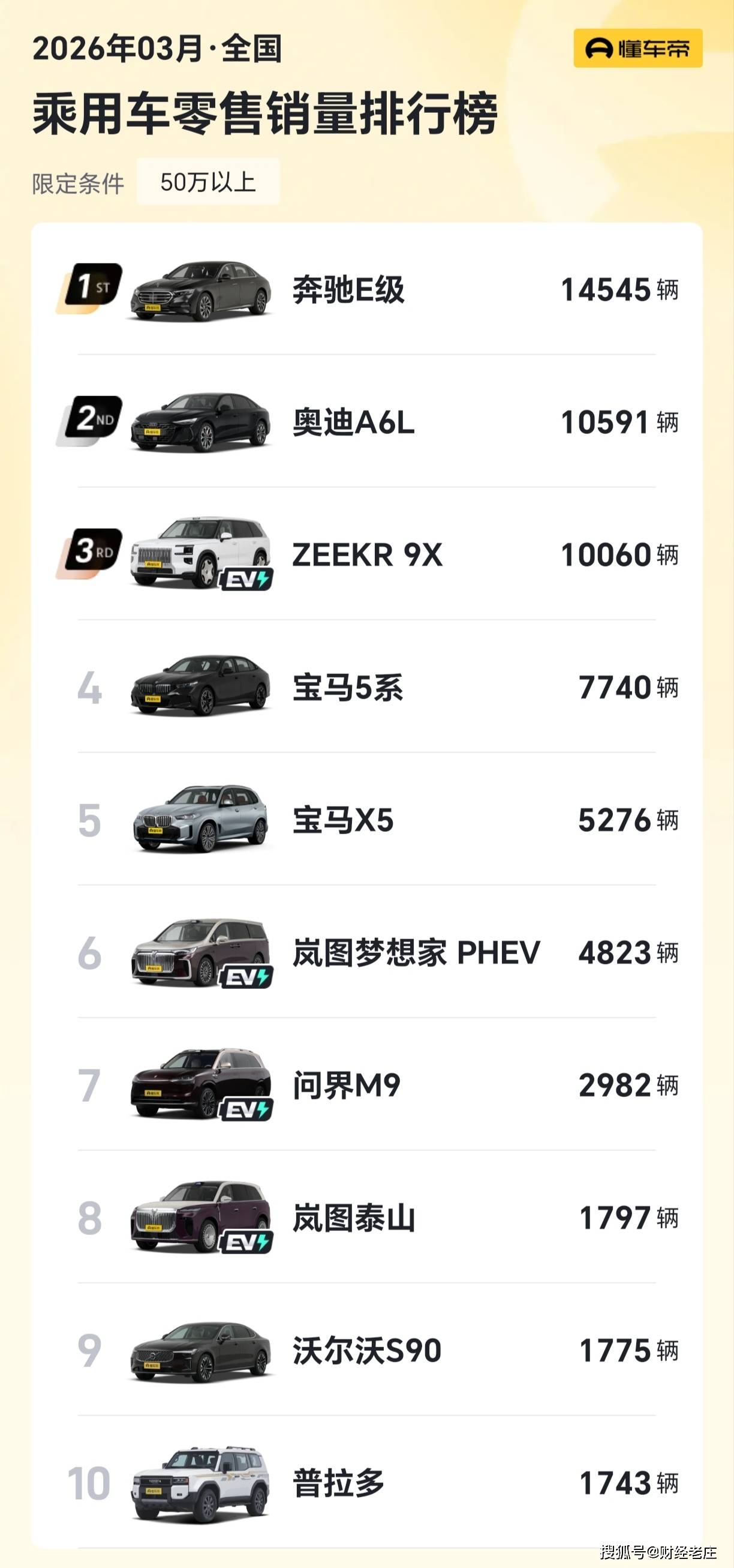 在最新公布的50萬級(jí)別豪車銷量榜單中,奔馳E級(jí)憑借出色表現(xiàn)榮登榜首,奧迪A6L與吉利極氪9X分列二、三位。此次榜單前十名的最低銷量門檻為1743輛,其中三款車型月銷量突破萬輛大關(guān),展現(xiàn)出高端市場(chǎng)的強(qiáng)勁活力。