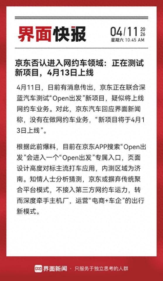 近日,有關京東涉足網約車領域的傳聞引發市場關注。此前有消息稱,京東正在聯合深藍汽車測試名為“Open出發”的新項目,并計劃上線網約車服務。對此,京東汽車方面向媒體明確回應,否認了開展網約車業務的計劃,僅表示將于4月13日推出全新項目。