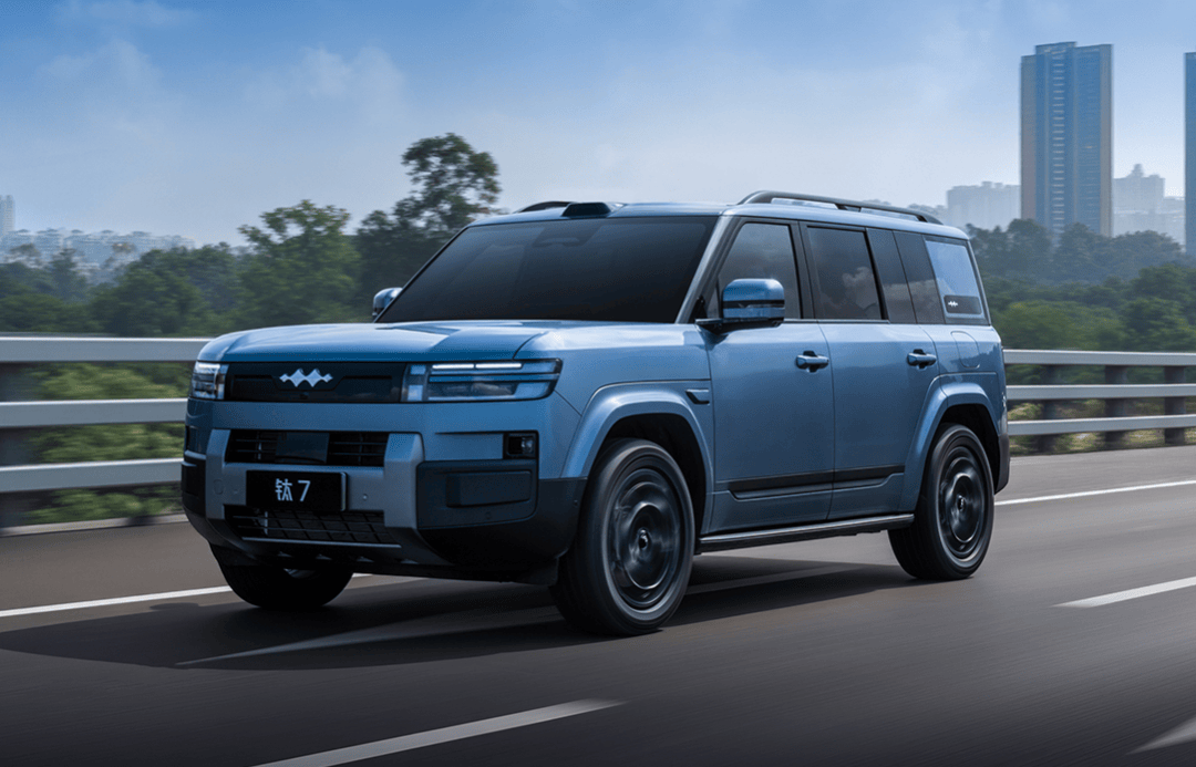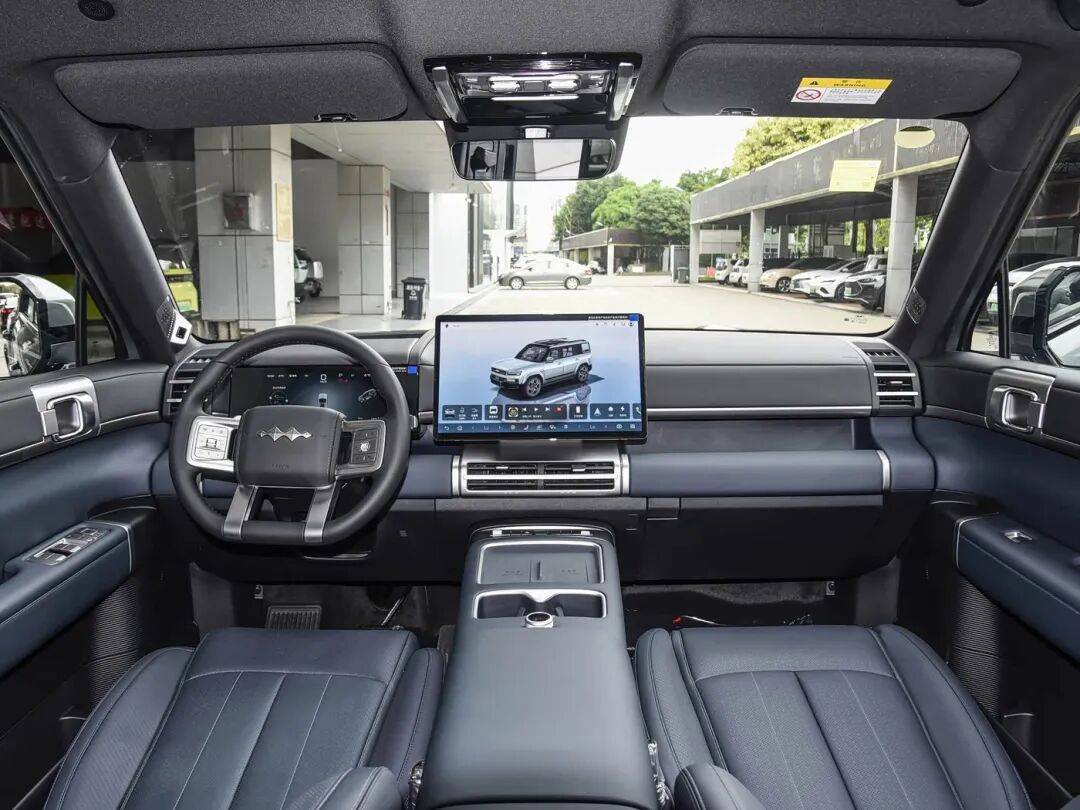外觀延續鈦7系列標志性設計語言,方正硬朗的車身搭配雙層LED大燈組,H型銀色前護板強化越野屬性。車頂激光雷達與24°接近角、25°離去角的設計,既滿足城市通勤的智能需求,又兼顧復雜路況的通過性。車尾雙L型尾燈與側開式尾門形成視覺呼應,外掛式儲物箱進一步拓展實用空間。尺寸方面,4999mm車長與2920mm軸距,為車內布局提供充足發揮空間。