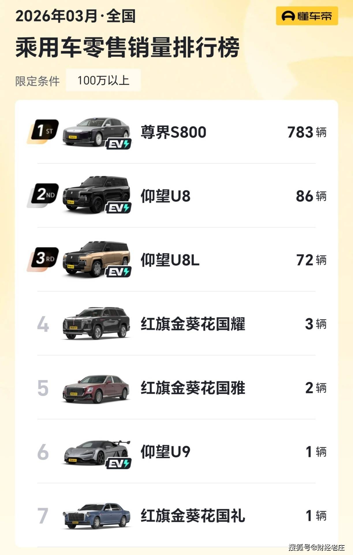 在最新公布的3月份百萬級車型銷量榜單中,江淮尊界S800以783輛的成績蟬聯冠軍,成為國產高端轎車突破價格天花板的標桿案例。同期入圍的7款車型中,比亞迪仰望系列貢獻3款,紅旗品牌貢獻3款,形成國產高端陣營三足鼎立格局。