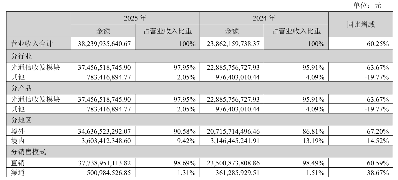 中際旭創(chuàng)股份有限公司(證券代碼:300308)最新公布的財務數(shù)據(jù)顯示,2025年公司經(jīng)營業(yè)績實現(xiàn)顯著增長。全年營業(yè)收入達382.4億元,同比增幅達60.25%,凈利潤突破百億大關(guān)至108億元,較上一年度增長108.78%。扣除非經(jīng)常性損益后,凈利潤仍保持111.31%的強勁增長,達到107.1億元。