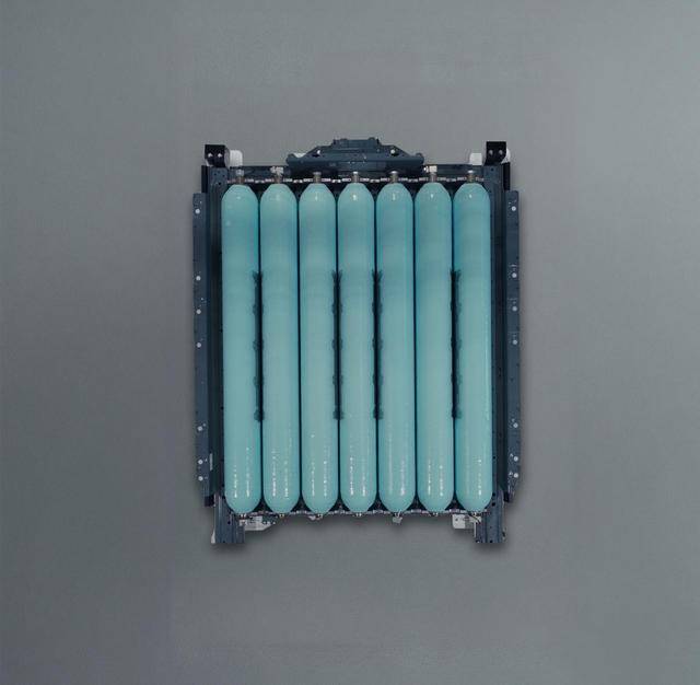 該系統(tǒng)的核心在于采用7個由碳纖維強(qiáng)化復(fù)合材料制成的高壓氫氣罐,這些氫氣罐被集成于一個堅固的金屬框架中,形成一體化結(jié)構(gòu)。通過并聯(lián)連接的多個儲存腔室和中央主閥門控制,整體體積較傳統(tǒng)設(shè)計縮小了30%,同時空間利用率提升45%。這種布局方式不僅避免了傳統(tǒng)分布式儲氫罐對車內(nèi)空間的占用,還確保了車體結(jié)構(gòu)的完整性,為乘客提供了更寬敞的乘坐環(huán)境。