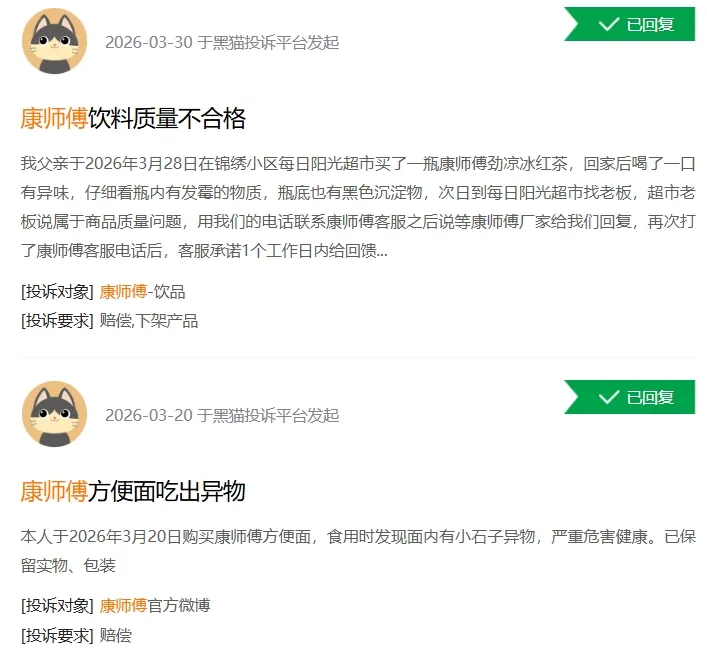 除了兌獎問題,近年來康師傅的品控問題也在消耗著消費者的信任。此前據《1818黃金眼》欄目報道,2025年8月底,杭州一消費者購保質期內康師傅冰紅茶,9月3日飲用時發現5-6厘米褐色異狀物。“黑貓投訴”平臺顯示,有超過4000條投訴中包含搜索詞“康師傅”,其中除了反映兌獎問題外,還有不少投訴反映康師傅方便面、飲料等產品出現異物等食品安全問題。