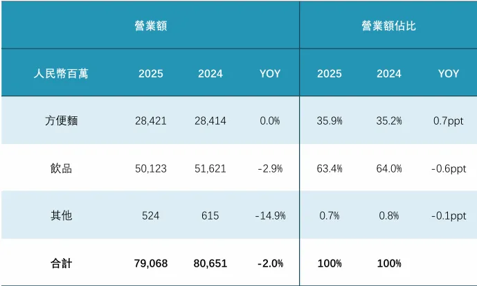 具體來看,2025年,除了碳酸及其他飲料業務,茶、水、果汁類別收入均出現下滑,下滑幅度超過5%,果汁收入下滑幅度更是達到15.1%。